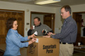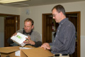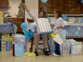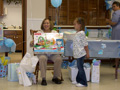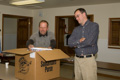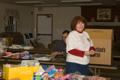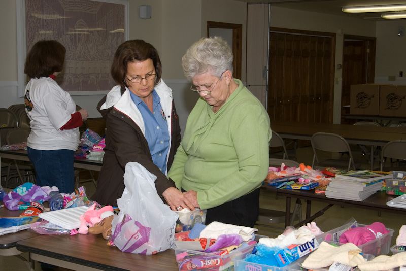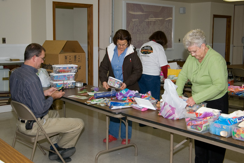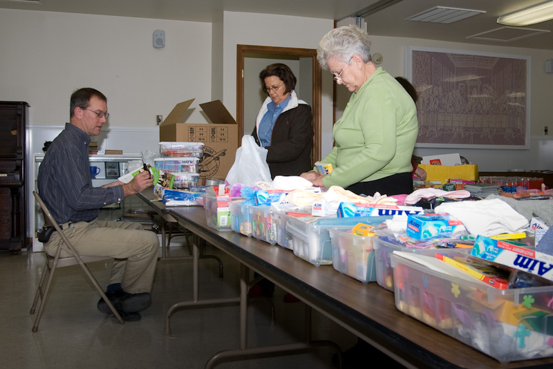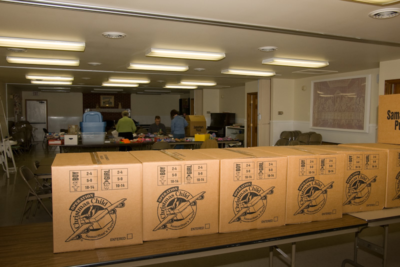 Stuffing shoe boxes for Christmas—tonight we stuffed some more shoe boxes for Operation Christmas Child. Deacons Charles and Randy, because of their great wisdom and good humor, were selected to pack the shoe boxes into the big cardboard boxes for shipment. Though Randy may have expressed his doubts once or twice, in the end all the shoeboxes made it into place.