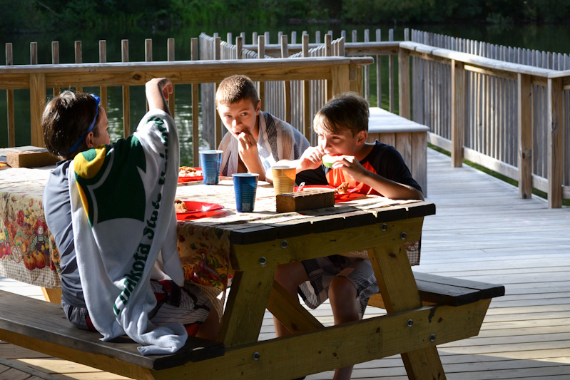 This afternoon were were blessed with fine weather and we had quite a gathering at the Pavilion at Presidential Lakes. We picknicked, canoed, played and sunned the afternoon away.