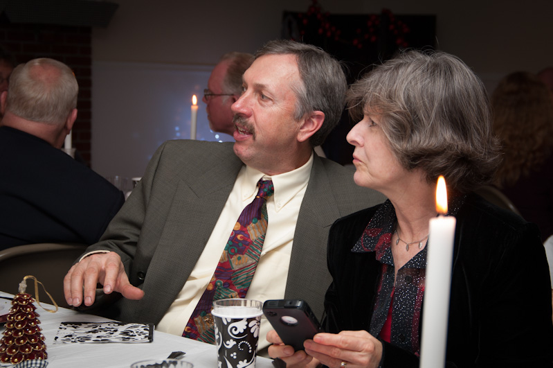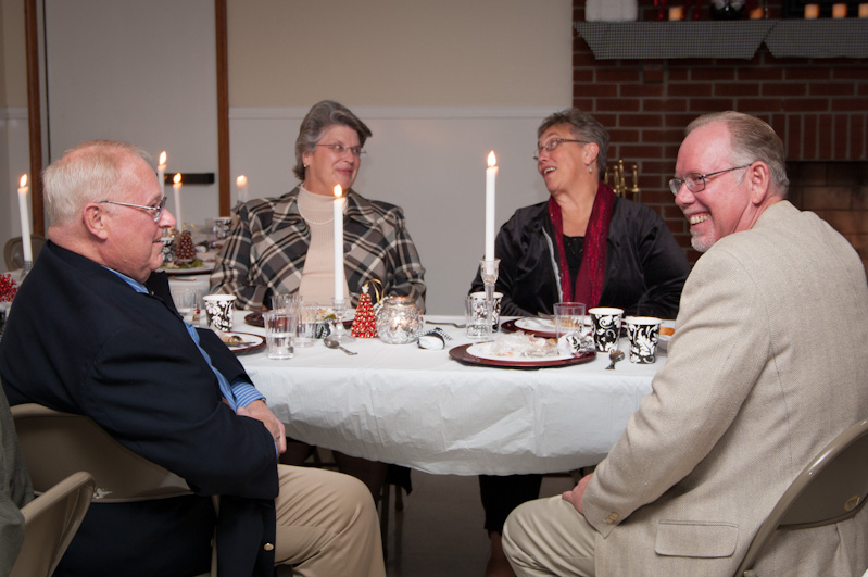 Tim, Cheryl, and their accomplices transformed the fellowship hall into a delightfully French candle-lit Christmas experience. We enjoyed dressing up and having adult conversations in an elegant atmosphere, all the while dining on roasted chicken, potatoes, asparagus, and fresh garden salad served in a French style.